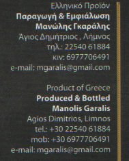 Με ξεχωριστό μεράκι παράγουμε τα κρασιά μας από επιλεγμένα αμπέλια βιολογικής καλλιέργειας στη Λήμνο.Επικοινωνήστε μαζί μας στο τηλ.6977706491και τηλ-fax2254061884.